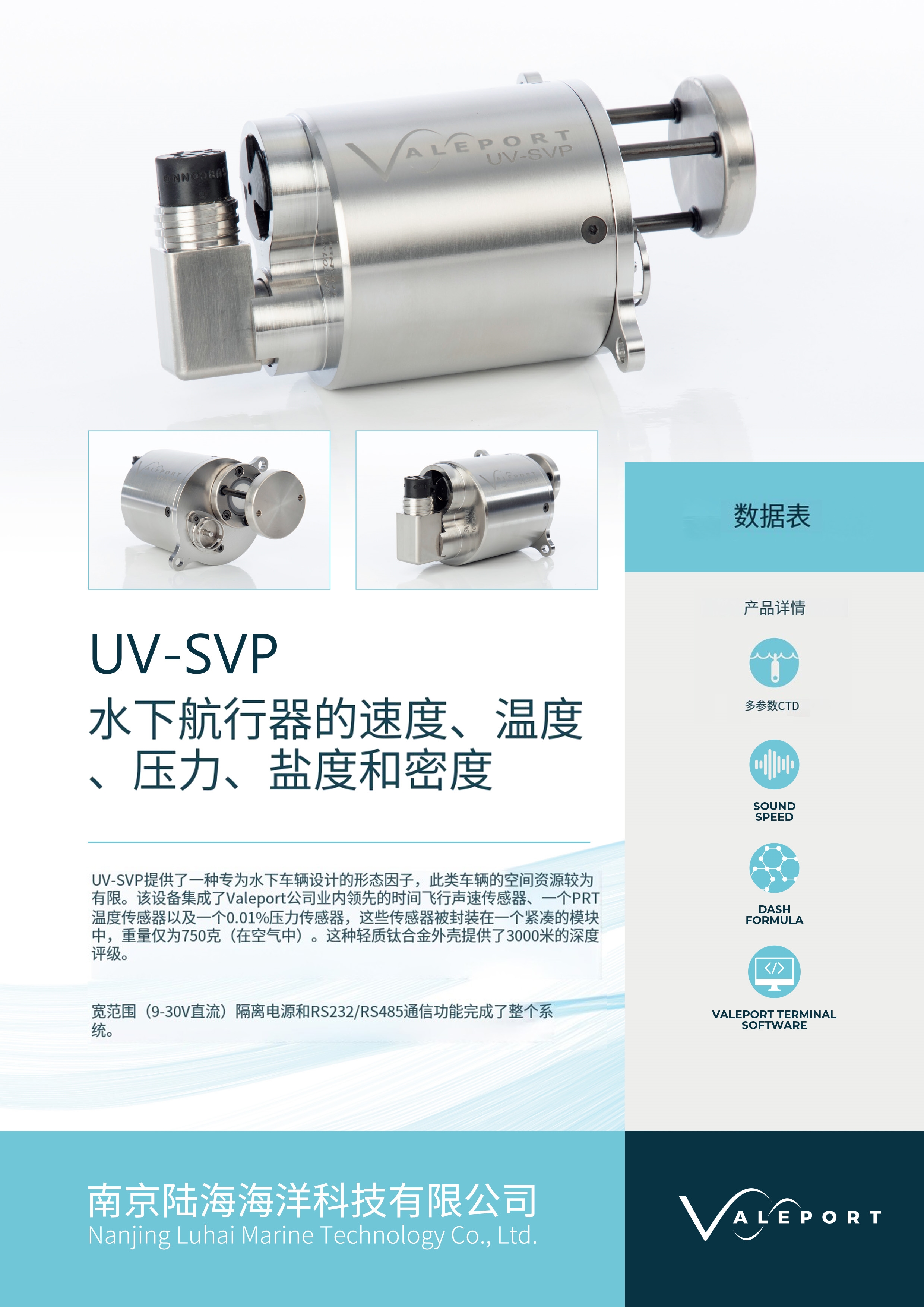 Valeport UV SVP声速剖面仪核心功能与目的实时声速测量: 其核心功能是在仪器下放过程中,直接、实时地测量水体中的声速值(通常单位:米/秒),而非通过温度、盐度、压力间接计算得到。生成声速剖面: 通过连续测量不同深度点的声速,仪器在单次下放过程中即可生成一条完整的、高分辨率的声速随深度变化的剖面图。关键应用: 精确的声速剖面数据对于以下领域至关重要:水声学: 水下声纳系统(多波束测深、侧扫声纳、声学通信、目标探测)的校准和数据处理,声波传播路径预测。声速误差是多波束测深的主要误差源之一。海洋测绘: 提高测深精度,尤其是在深水和声速梯度变化大的区域。水文测量与调查: 海洋物理研究、环境监测、资源勘探。水下定位与导航: 为水下机器人(AUV/ROV)、潜水器等提供精确的声速环境信息。地球物理学: 辅助地震勘探等。